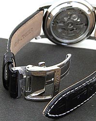 | ※注意:この時計は元々海外向けの為、革ベルトは体の大きな外国人にも対応できるよう、少し長尺の物が付いております。女性の方や手首が細い方はサイズが合わないケースがありますので、あらかじめご了承下さい。(適応サイズは手首サイズの実寸が17〜22.5cmですが、細い方ほど6時側のベルトが長くなり、バランスが悪くなります。) この件に関しまして、お客様から非常に実用的なアドバイスをいただきました。曰く「ベルトの件ですが、その後時計をひっくり返したりしながら色々と考えて、とりあえずですが、回避することが出来ましたのでご報告いたします。ベルトをばね棒外しを使って一旦本体から外して、12時側と6時側を逆に取り付けます。 すると・・・ロックするときに少々戸惑いますが、あら不思議!結構しっくりくるのです。(私の場合、一番本体寄りの穴を使用してます)」だそうです。手首が細い方はご参考にしてみてください。 尚、この作業には当方で販売しております「バネ棒工具」をご使用いただくとスムーズにはかどります!(笑) |