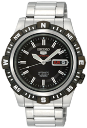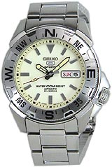 渋いクッションケース形状に大型の簡易方位計ベゼルと12時位置の夜光三角インデックスがたいへんカッコ良い 5 スポーツです! 仕様:ステンレスケース・4R36(24石)新型(手巻/秒針停止機能つき)自動巻キャリバー・10気圧/日常生活強化防水・シースルーバック(裏スケ)・簡易方位計機能付き回転ベゼル・ダイバーズ用プッシュ式ダブルバックル付きフローティングステンレスベルト又はナイロンベルト・ベゼル径(リューズ・リューズガードを含まない幅)約45mm/ラグ巾22mm・カレンダー曜日(英語/スペイン語表記)日本製は(英語/アラビア語表記)、日付表示・重さ約179g / ナイロンベルト仕様約103g |