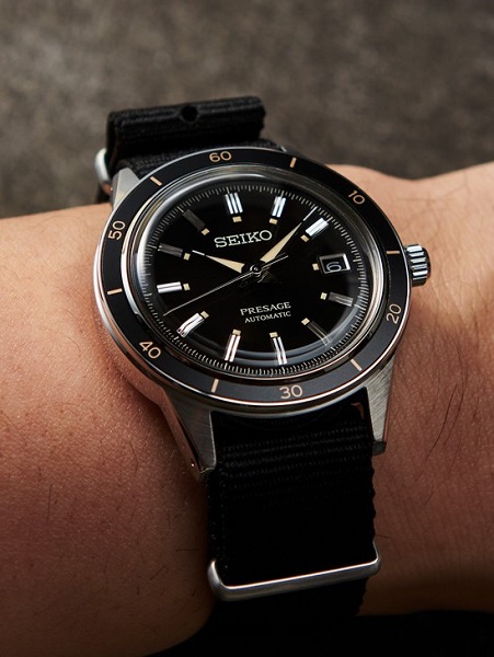 | インデックス周囲の外周部に、仕上げを分けた面を円状に配置しています。これにより、視認性を向上させるだけでなく、見る角度によって表情を変える暖かみのあるダイヤルを実現し、丸みを帯びたケースは手首にしっかりと固定されるよう内側に傾斜した形状となっており、心地よい装着感を実現。かん足には丁寧な研磨によって鏡面仕上げを施した面を追加し、落ち着いた佇まいの中にシャープな印象を併せ持つことで、ヴィンテージ感を醸成しつつ、現代のライフスタイルに寄り添うデザインに仕上がっています。 このNATOナイロンベルトも悪くないですが、私なら茶系の革ベルトをスペアに買い足して楽しみます! |