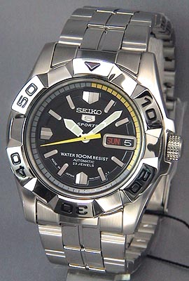 ベゼルが特徴的なシーリーズです。 文字盤は真っ黒の艶ありタイプです。意外と大きな回転ベゼルはポリッシュ仕上げと抑揚のあるでこぼこしたデザインのためか??その大きさを感じさせません。 インナーベゼルはベースはグレーで20分のところまで黄色に色分けされています。 また、写真ではわかりにくいですが、インデックスの半分まで食い込むような、立体的なつくりになっています。秒針の形も斬新で、色といい形といい、このシリーズの特徴の一つとなっています。 インデックス(6/9/12時位置インデックスはホームベースのような五角形)はシルバーのポリッシュ仕上げ。ベゼルとケースサイドとベルトの真ん中部分はポリッシュ仕上げで、ケース正面部分とベルト両側はヘアライン仕上げです。 SNZE47J1