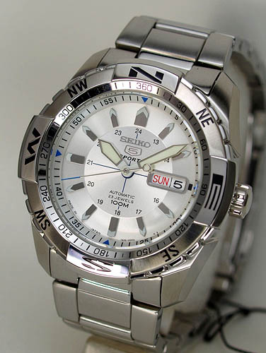 迫力のある形と大きくデザインされた方位表示のベゼルが特徴的なモデルです。 文字盤はマット仕上げされた落ち着いたシルバーに、外側のインデックス部分は仕上げが違い、レコードのような細い溝があります。 文字盤を4分割するブルーラインや秒針先等、各ポイントに使われたブルーカラーがシルバーの文字盤にとてもマッチして、さわやかな印象を与えます。 また、インデックスはアップライト型で矢印の様に見える白い部分は夜光です。 それにしてもこの幅広のラグが更に圧倒的な迫力感を醸し出しています。 各部の仕上げはケースサイドの真ん中部分とベゼルN・E・S・W部分とそのサイド、それにベルトサイドとその正面の一部がポリッシュ仕上げで、その他はヘアライン仕上げです。 SNZJ03J1 ※検索で来られた方へ Mr.Shop時計屋 トップページはこちらです。 |